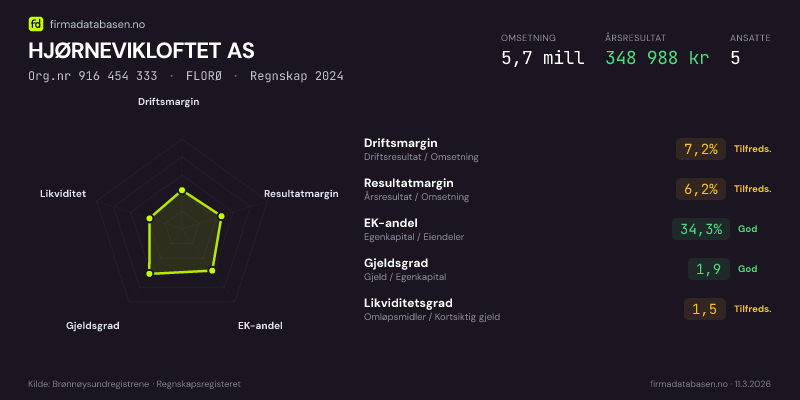 HJØRNEVIKLOFTET AS hadde en omsetning på 5,7 MNOK for regnskapsåret 2024 ifølge siste innsendte årsregnskap. Regnskapstallene hentes fra Brønnøysundregistrene.