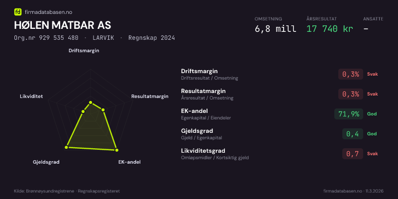HØLEN MATBAR AS,LARVIK — jo større areal, jo sterkere økonomi.Org.nr 929 535 480 · Regnskap2024