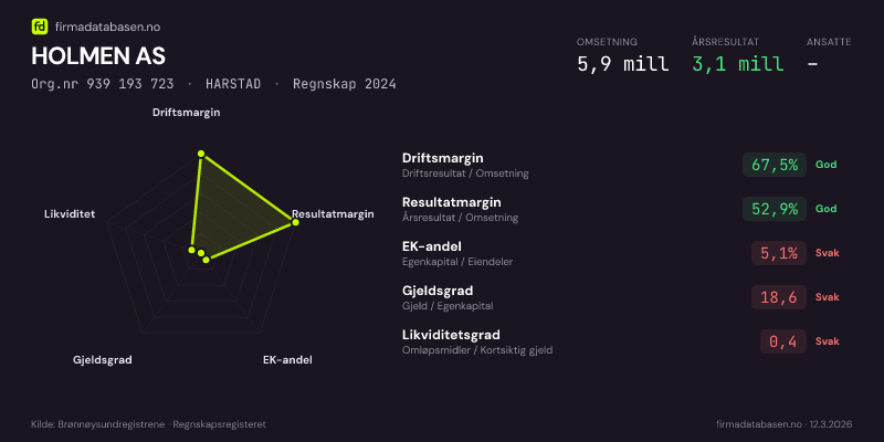 HOLMEN AS er et aksjeselskap, innen utleie av egen eller leid fast eiendom, stiftet i 1985 i Harstad. I 2024 hadde selskapet en omsetning på 5.9 mill og en driftsmargin på 67.5 %.