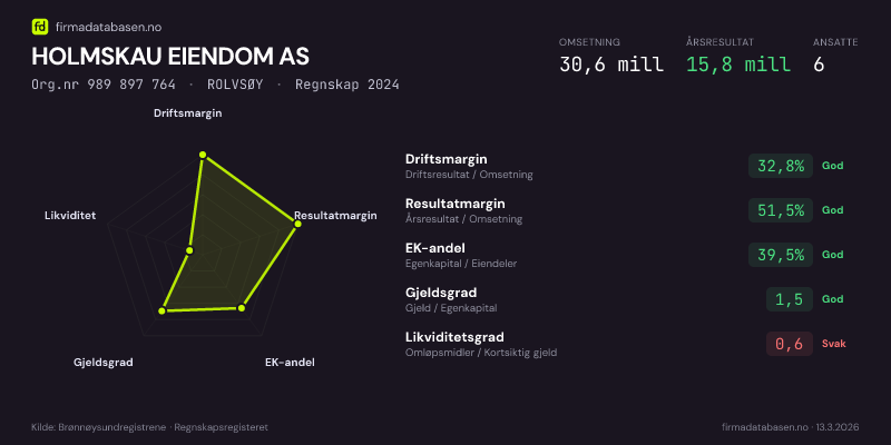 HOLMSKAU EIENDOM AS hadde en omsetning på 30,6 MNOK for regnskapsåret 2024 ifølge siste innsendte årsregnskap. Regnskapstallene hentes fra Brønnøysundregistrene.