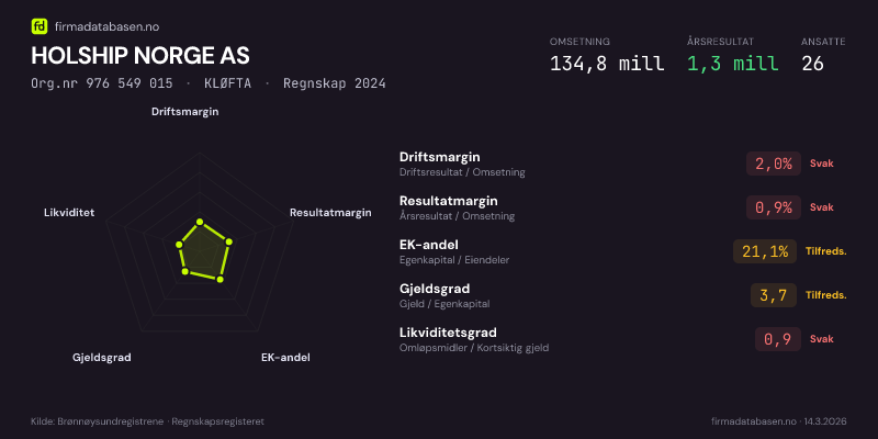 HOLSHIP NORGE AS hadde en omsetning på 134.8 mill i 2024, med driftsmargin på 2.0%.
