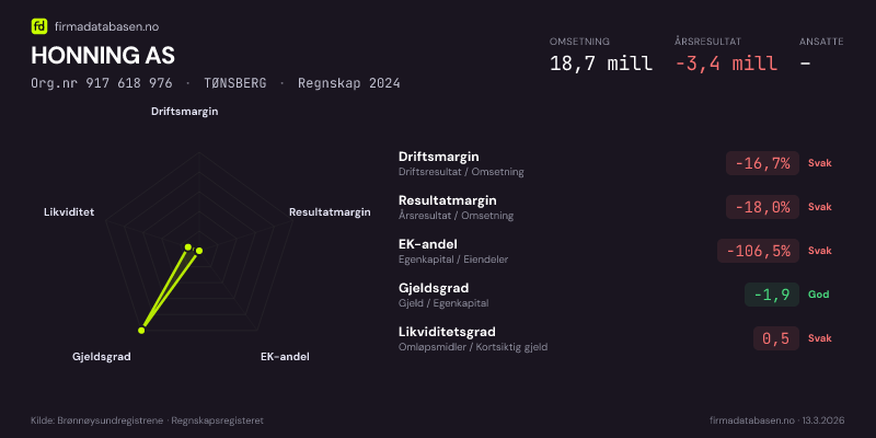 Firmadatabasen.no oppdateres nattlig med nye data fra Brønnøysundregistrene. Endringer i roller, adresse, status og andre registerdata fanges opp automatisk. Du kan følge HONNING AS og få varsel på e-post når vi registrerer endringer — klikk «Følg selskap» øverst på denne siden.