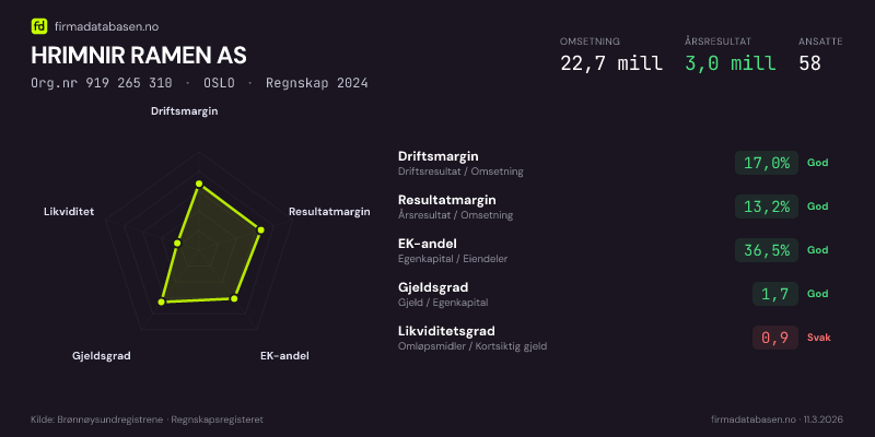 HRIMNIR RAMEN AS hadde en omsetning på 22,7 MNOK for regnskapsåret 2024 ifølge siste innsendte årsregnskap. Regnskapstallene hentes fra Brønnøysundregistrene.