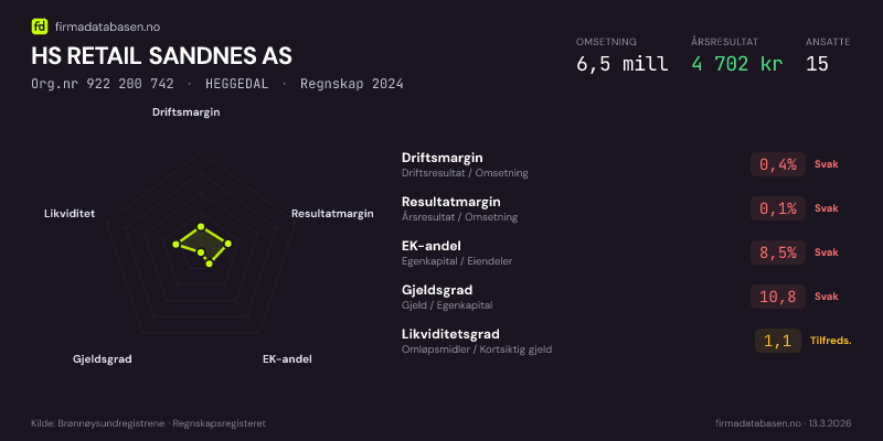 HS RETAIL SANDNES AS hadde en omsetning på 6,5 MNOK for regnskapsåret 2024 ifølge siste innsendte årsregnskap. Regnskapstallene hentes fra Brønnøysundregistrene.
