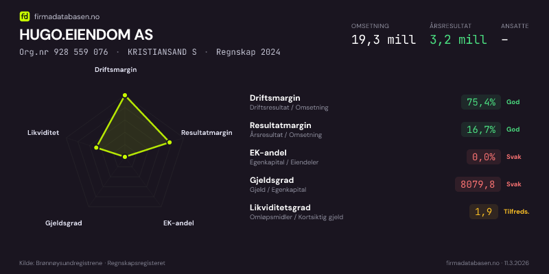 HUGO.EIENDOM AS,KRISTIANSAND S — jo større areal, jo sterkere økonomi.Org.nr 928 559 076 · Regnskap2024