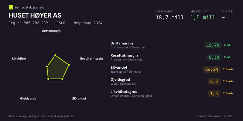 HUSET HØYER AS hadde en omsetning på 18,7 MNOK for regnskapsåret 2024 ifølge siste innsendte årsregnskap. Regnskapstallene hentes fra Brønnøysundregistrene.