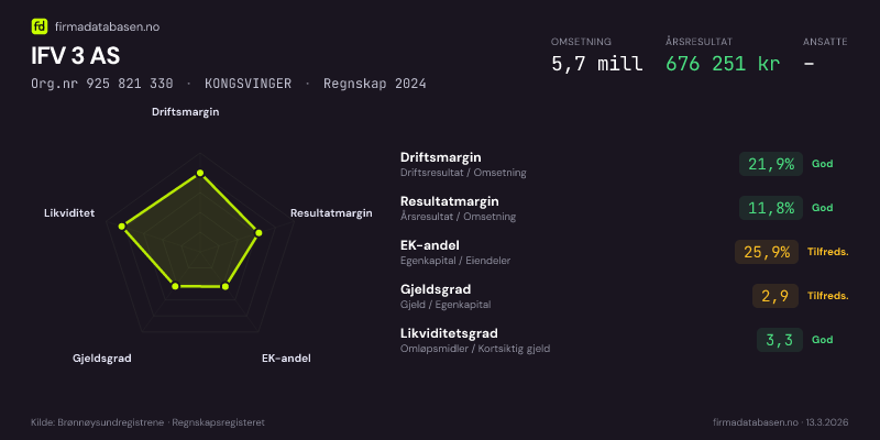 IFV 3 AS hadde en omsetning på 5,7 MNOK for regnskapsåret 2024 ifølge siste innsendte årsregnskap. Regnskapstallene hentes fra Brønnøysundregistrene.