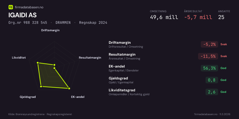 IGAIDI AS hadde en omsetning på 49,6 MNOK for regnskapsåret 2024 ifølge siste innsendte årsregnskap. Regnskapstallene hentes fra Brønnøysundregistrene.