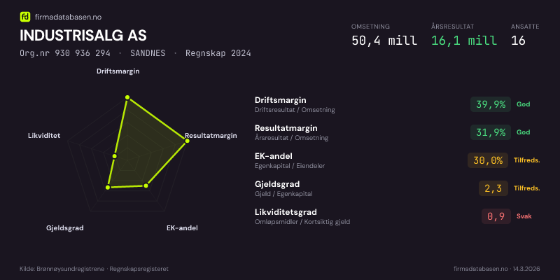 INDUSTRISALG AS,SANDNES — jo større areal, jo sterkere økonomi.Org.nr 930 936 294 · Regnskap2024
