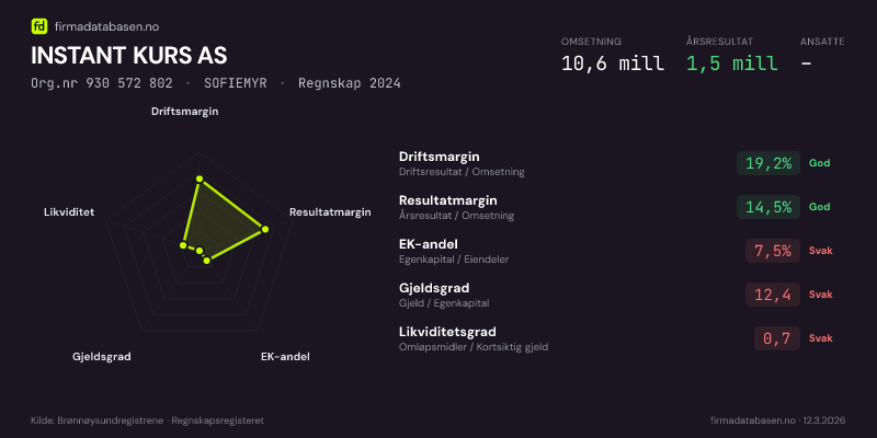 INSTANT KURS AS hadde en omsetning på 10,6 MNOK for regnskapsåret 2024 ifølge siste innsendte årsregnskap. Regnskapstallene hentes fra Brønnøysundregistrene.