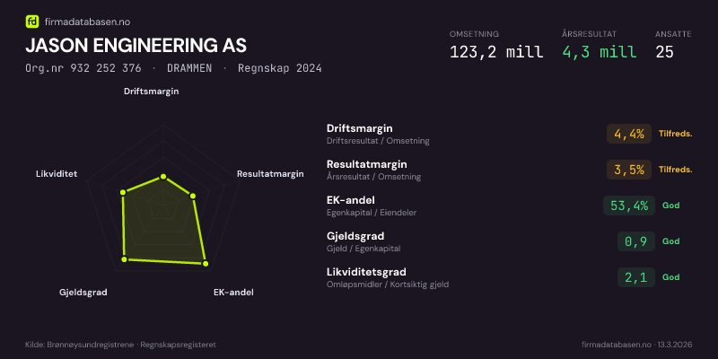 JASON ENGINEERING AS hadde en omsetning på 123.2 mill i 2024, med driftsmargin på 4.4%.