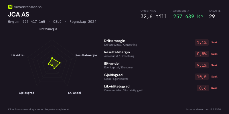 JCA AS hadde en omsetning på 32,6 MNOK for regnskapsåret 2024 ifølge siste innsendte årsregnskap. Regnskapstallene hentes fra Brønnøysundregistrene.