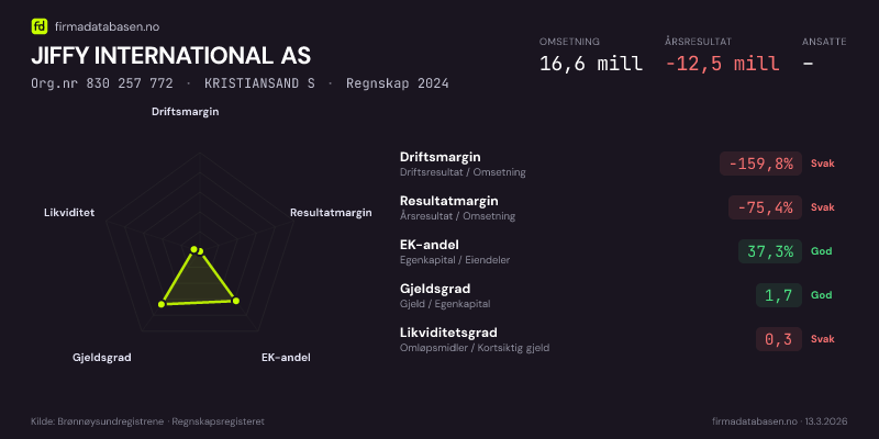 JIFFY INTERNATIONAL AS hadde en omsetning på 16.6 mill i 2024, med driftsmargin på -159.8%.
