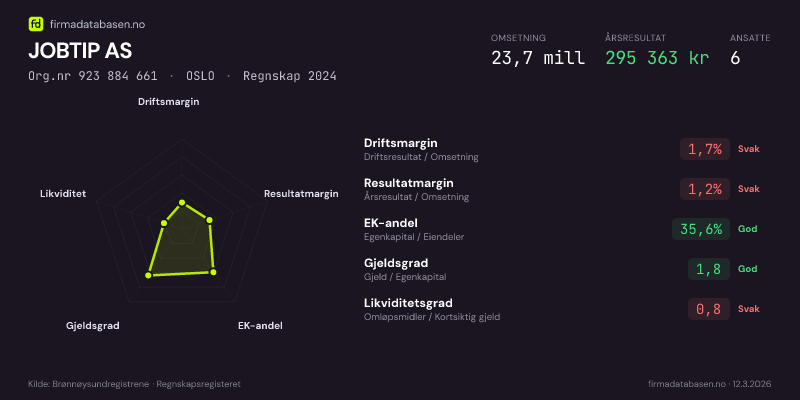 JOBTIP AS hadde en omsetning på 23.7 mill i 2024, med driftsmargin på 1.7%.