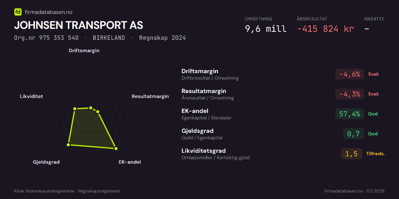 JOHNSEN TRANSPORT AS hadde en omsetning på 9.6 mill i 2024, med driftsmargin på -4.6%.