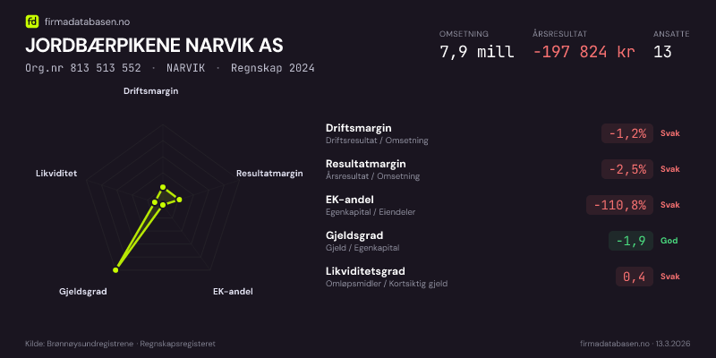 JORDBÆRPIKENE NARVIK AS,NARVIK — jo større areal, jo sterkere økonomi.Org.nr 813 513 552 · Regnskap2024