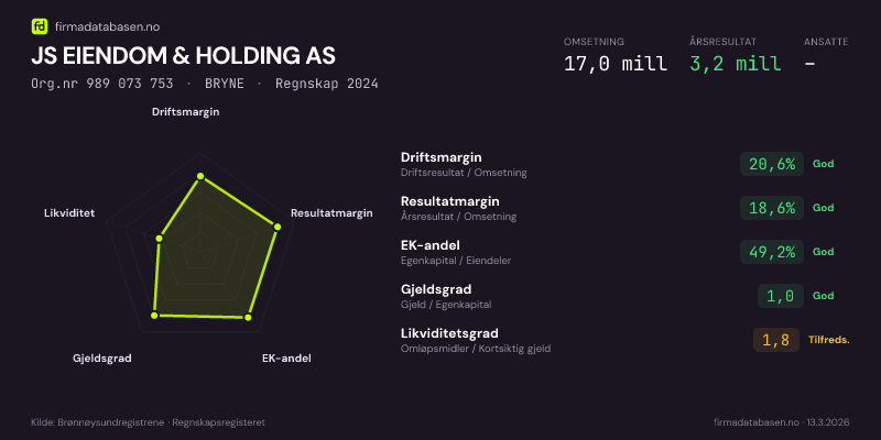 JS EIENDOM & HOLDING AS hadde en omsetning på 17,0 MNOK for regnskapsåret 2024 ifølge siste innsendte årsregnskap. Regnskapstallene hentes fra Brønnøysundregistrene.