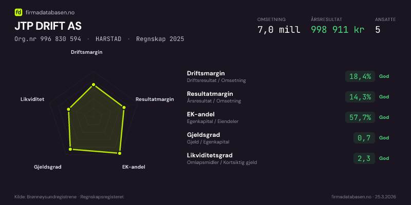 JTP DRIFT AS,HARSTAD — jo større areal, jo sterkere økonomi.Org.nr 996 830 594 · Regnskap2025