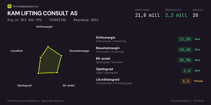 KAM LIFTING CONSULT AS,VIGRESTAD — jo større areal, jo sterkere økonomi.Org.nr 812 026 992 · Regnskap2024