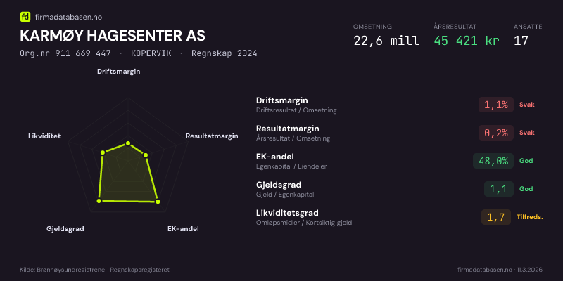 KARMØY HAGESENTER AS,KOPERVIK — jo større areal, jo sterkere økonomi.Org.nr 911 669 447 · Regnskap2024
