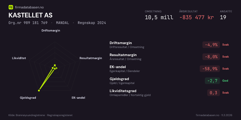 KASTELLET AS hadde en omsetning på 10.5 mill i 2024, med driftsmargin på -4.9%.