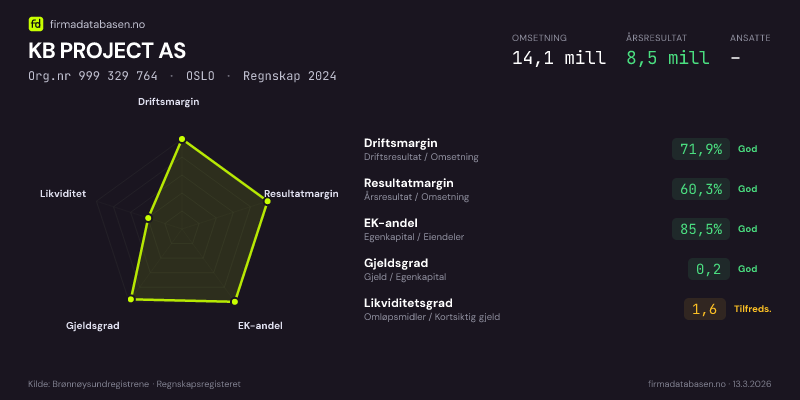 KB PROJECT AS er et aksjeselskap, innen utleie av egen eller leid fast eiendom, stiftet i 2012 i Oslo. I 2024 hadde selskapet en omsetning på 14.1 mill og en driftsmargin på 71.9 %.