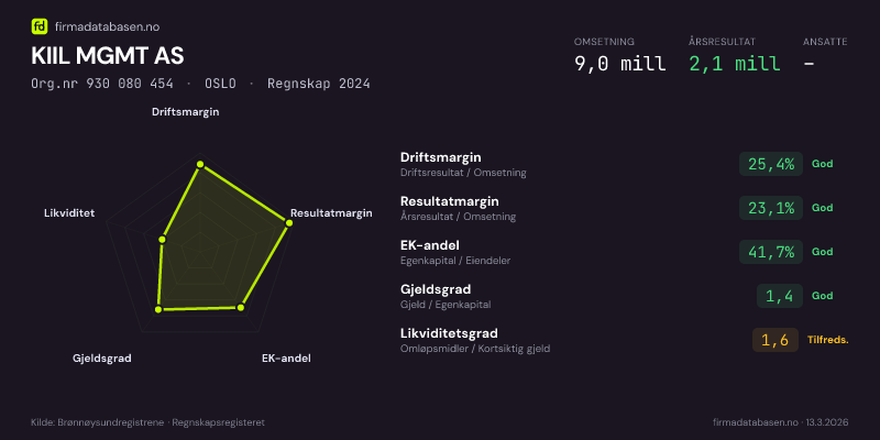 KIIL MGMT AS hadde en omsetning på 9,0 MNOK for regnskapsåret 2024 ifølge siste innsendte årsregnskap. Regnskapstallene hentes fra Brønnøysundregistrene.