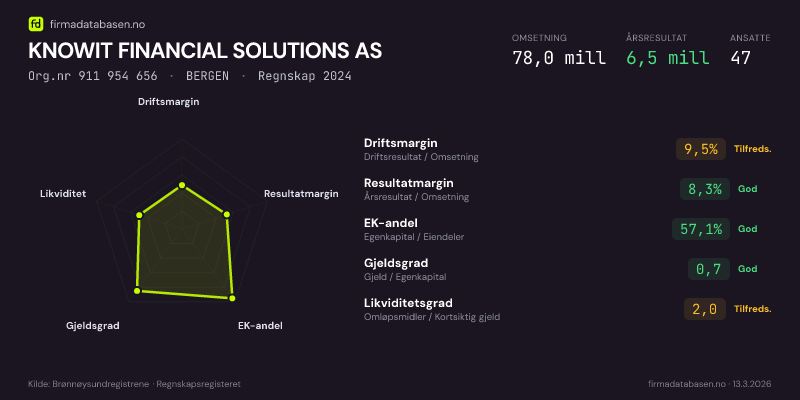 KNOWIT FINANCIAL SOLUTIONS AS hadde en omsetning på 78.0 mill i 2024, med driftsmargin på 9.5%.