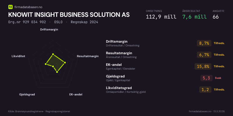 KNOWIT INSIGHT BUSINESS SOLUTION AS hadde en omsetning på 112.9 mill i 2024, med driftsmargin på 8.7%.