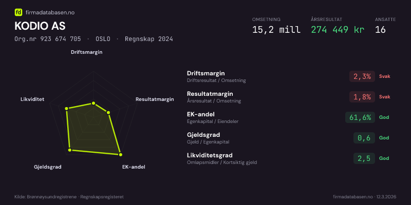 KODIO AS hadde en omsetning på 15,2 MNOK for regnskapsåret 2024 ifølge siste innsendte årsregnskap. Regnskapstallene hentes fra Brønnøysundregistrene.