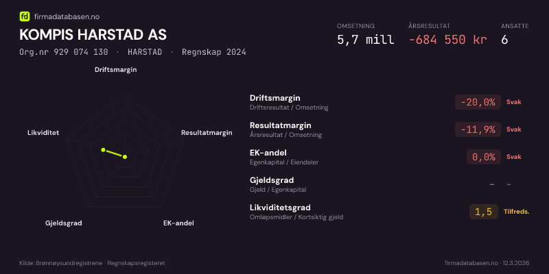 KOMPIS HARSTAD AS hadde en omsetning på 5,7 MNOK for regnskapsåret 2024 ifølge siste innsendte årsregnskap. Regnskapstallene hentes fra Brønnøysundregistrene.