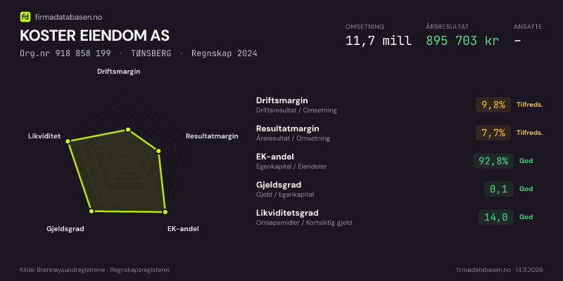 KOSTER EIENDOM AS,TØNSBERG — jo større areal, jo sterkere økonomi.Org.nr 918 858 199 · Regnskap2024