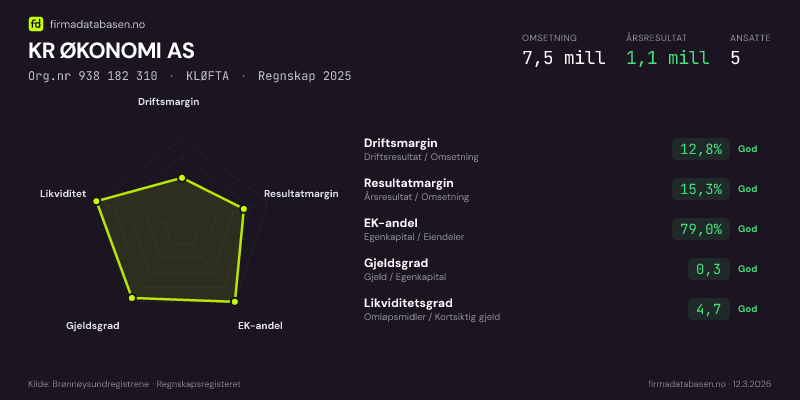 KR ØKONOMI AS hadde en omsetning på 7,5 MNOK for regnskapsåret 2025 ifølge siste innsendte årsregnskap. Regnskapstallene hentes fra Brønnøysundregistrene.