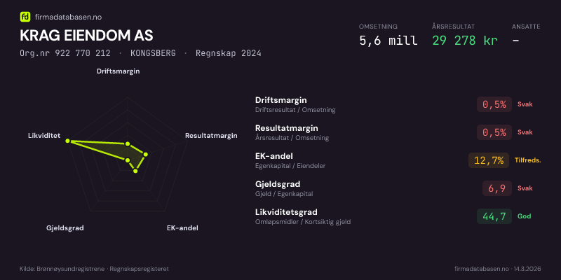 KRAG EIENDOM AS hadde en omsetning på 5,6 MNOK for regnskapsåret 2024 ifølge siste innsendte årsregnskap. Regnskapstallene hentes fra Brønnøysundregistrene.