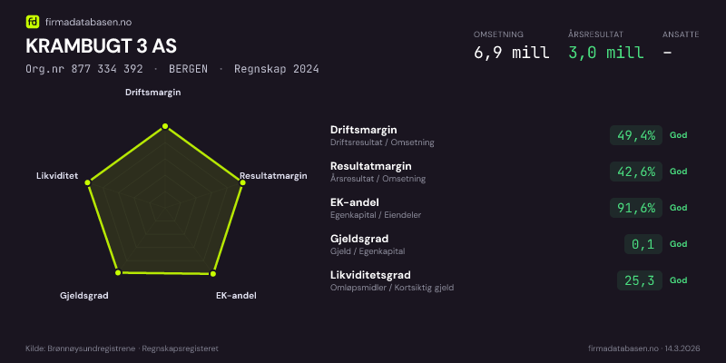 KRAMBUGT 3 AS hadde en omsetning på 6,9 MNOK for regnskapsåret 2024 ifølge siste innsendte årsregnskap. Regnskapstallene hentes fra Brønnøysundregistrene.
