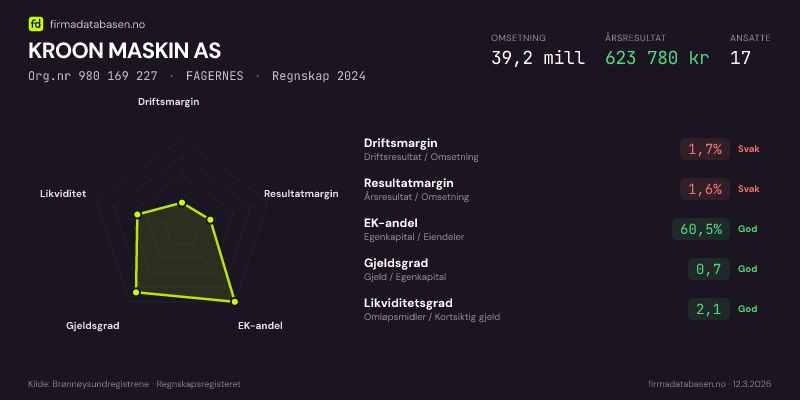 KROON MASKIN AS,FAGERNES — jo større areal, jo sterkere økonomi.Org.nr 980 169 227 · Regnskap2024