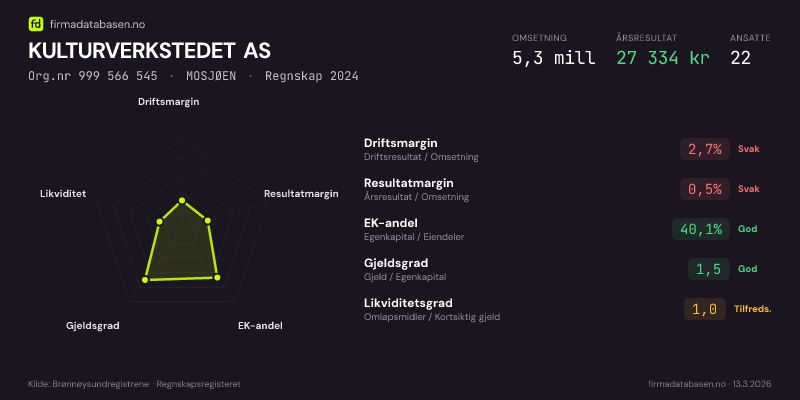 KULTURVERKSTEDET AS,MOSJØEN — jo større areal, jo sterkere økonomi.Org.nr 999 566 545 · Regnskap2024