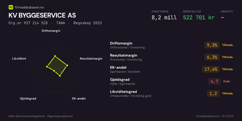KV BYGGESERVICE AS,TANA — jo større areal, jo sterkere økonomi.Org.nr 927 214 520 · Regnskap2023