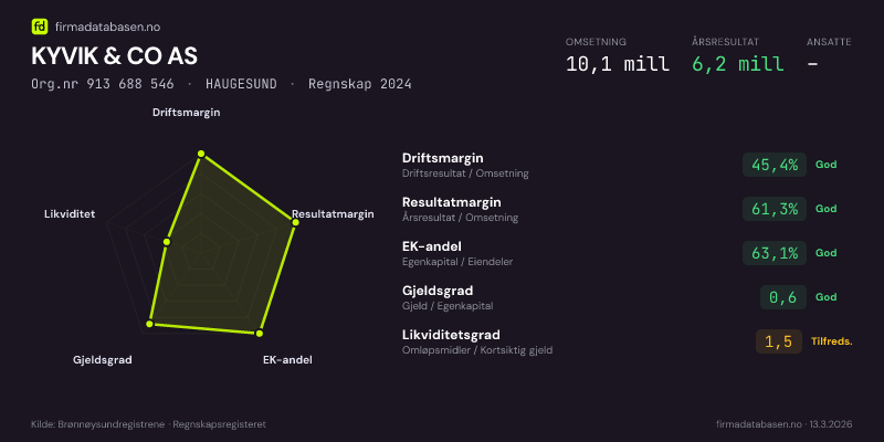 KYVIK & CO AS,HAUGESUND — jo større areal, jo sterkere økonomi.Org.nr 913 688 546 · Regnskap2024