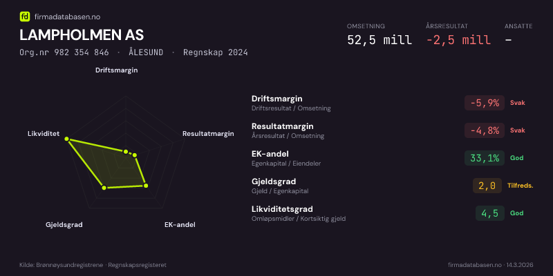 LAMPHOLMEN AS hadde en omsetning på 52,5 MNOK for regnskapsåret 2024 ifølge siste innsendte årsregnskap. Regnskapstallene hentes fra Brønnøysundregistrene.