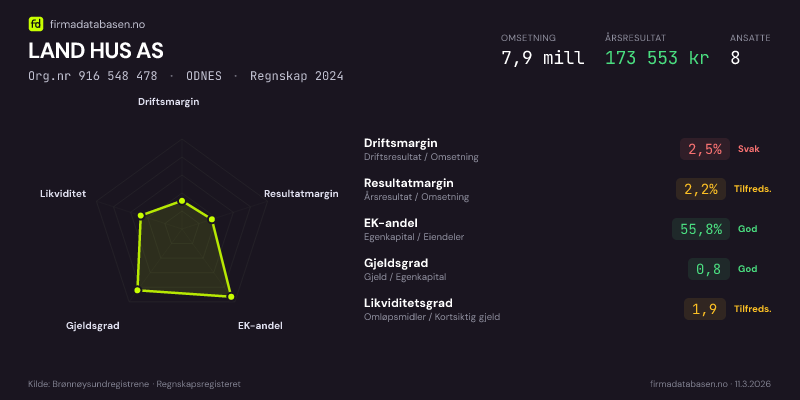 LAND HUS AS,ODNES — jo større areal, jo sterkere økonomi.Org.nr 916 548 478 · Regnskap2024