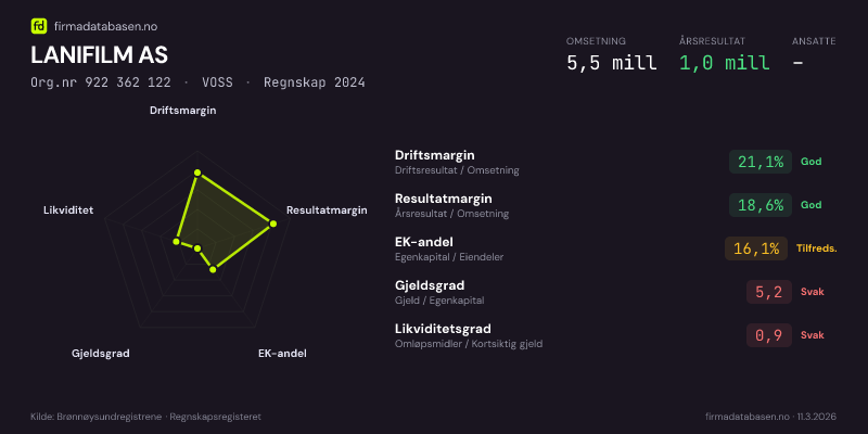 LANIFILM AS hadde en omsetning på 5,5 MNOK for regnskapsåret 2024 ifølge siste innsendte årsregnskap. Regnskapstallene hentes fra Brønnøysundregistrene.