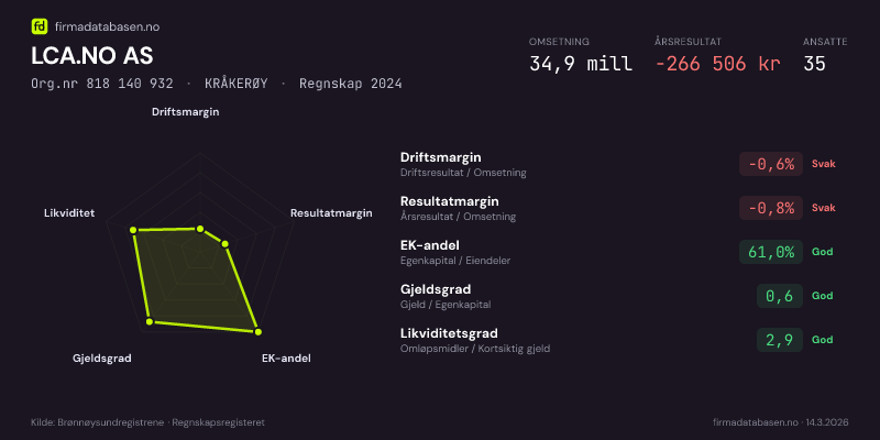 LCA.NO AS hadde en omsetning på 34,9 MNOK for regnskapsåret 2024 ifølge siste innsendte årsregnskap. Regnskapstallene hentes fra Brønnøysundregistrene.