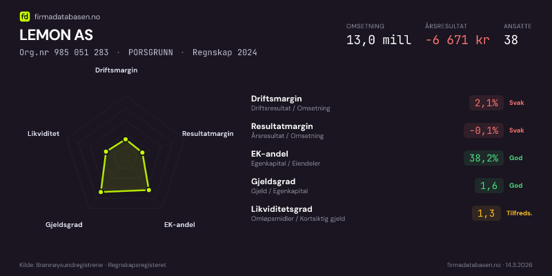 LEMON AS hadde en omsetning på 13,0 MNOK for regnskapsåret 2024 ifølge siste innsendte årsregnskap. Regnskapstallene hentes fra Brønnøysundregistrene.