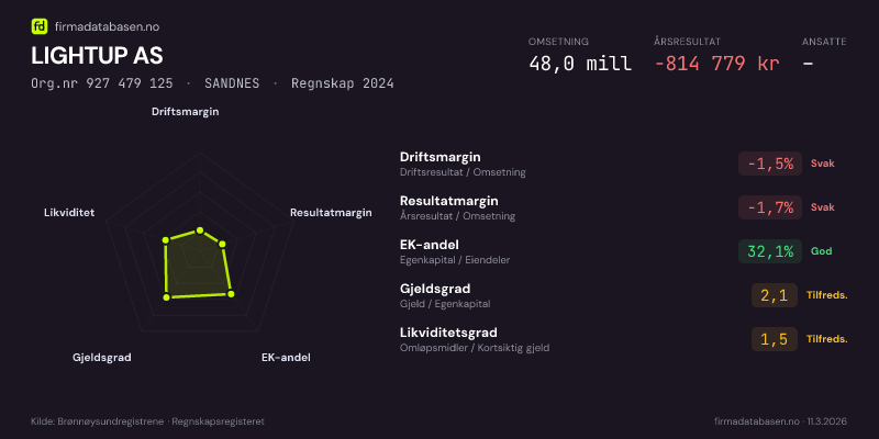 LIGHTUP AS hadde en omsetning på 48,0 MNOK for regnskapsåret 2024 ifølge siste innsendte årsregnskap. Regnskapstallene hentes fra Brønnøysundregistrene.