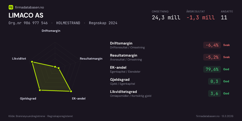 LIMACO AS hadde en omsetning på 24,3 MNOK for regnskapsåret 2024 ifølge siste innsendte årsregnskap. Regnskapstallene hentes fra Brønnøysundregistrene.