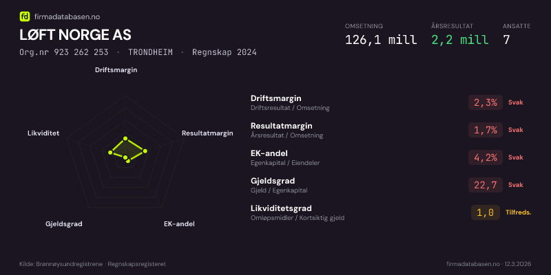 LØFT NORGE AS hadde en omsetning på 126,1 MNOK for regnskapsåret 2024 ifølge siste innsendte årsregnskap. Regnskapstallene hentes fra Brønnøysundregistrene.