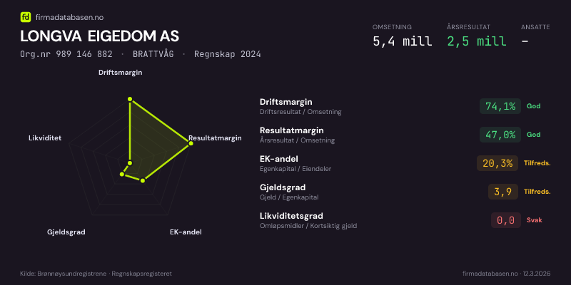 LONGVA EIGEDOM AS hadde en omsetning på 5,4 MNOK for regnskapsåret 2024 ifølge siste innsendte årsregnskap. Regnskapstallene hentes fra Brønnøysundregistrene.