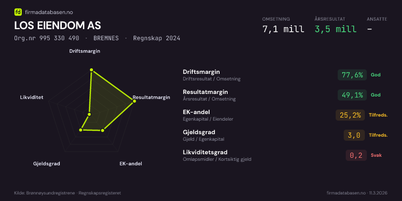 LOS EIENDOM AS er et aksjeselskap, innen utleie av egen eller leid fast eiendom, stiftet i 2010 i Bremnes. I 2024 hadde selskapet en omsetning på 7.1 mill og en driftsmargin på 77.6 %.