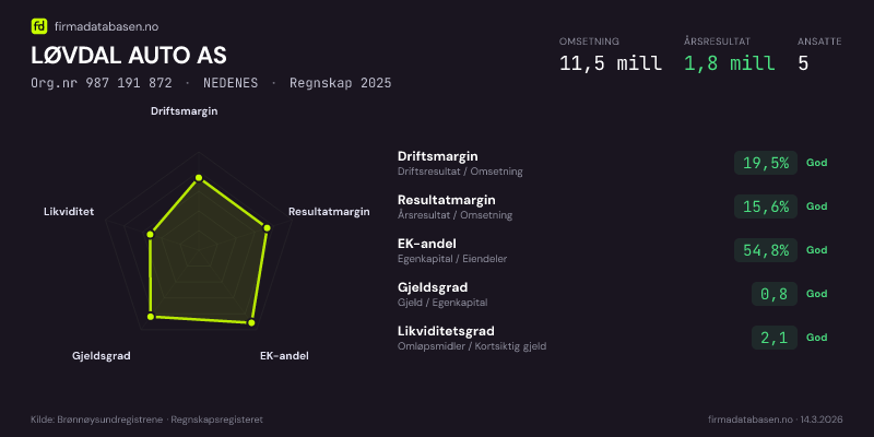 LØVDAL AUTO AS hadde en omsetning på 11.5 mill i 2025, med driftsmargin på 19.5%.